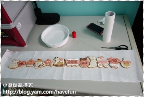 全部拍好照要穿線時才發現,白色衣服那塊餅乾少打一個洞@@