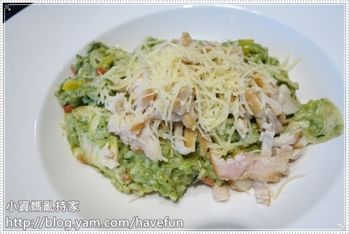 羅勒燻雞燉飯,雞肉做的很嫩,青醬的味道不會太重,是小朋友也可以接受的程度