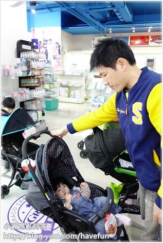 讓妹妹試坐了一下,後來服務人員才說,正常版的推車可以試坐,但是整修品不行喔!