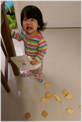 某次把桌上的餅乾抓下來灑了一地,我只是叫她名字,就開始尖叫大哭,先哭先贏的策略媽媽實在輸了....
