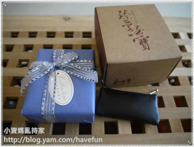 臍帶印章的木盒用包裝紙跟緞帶包裝的很漂亮